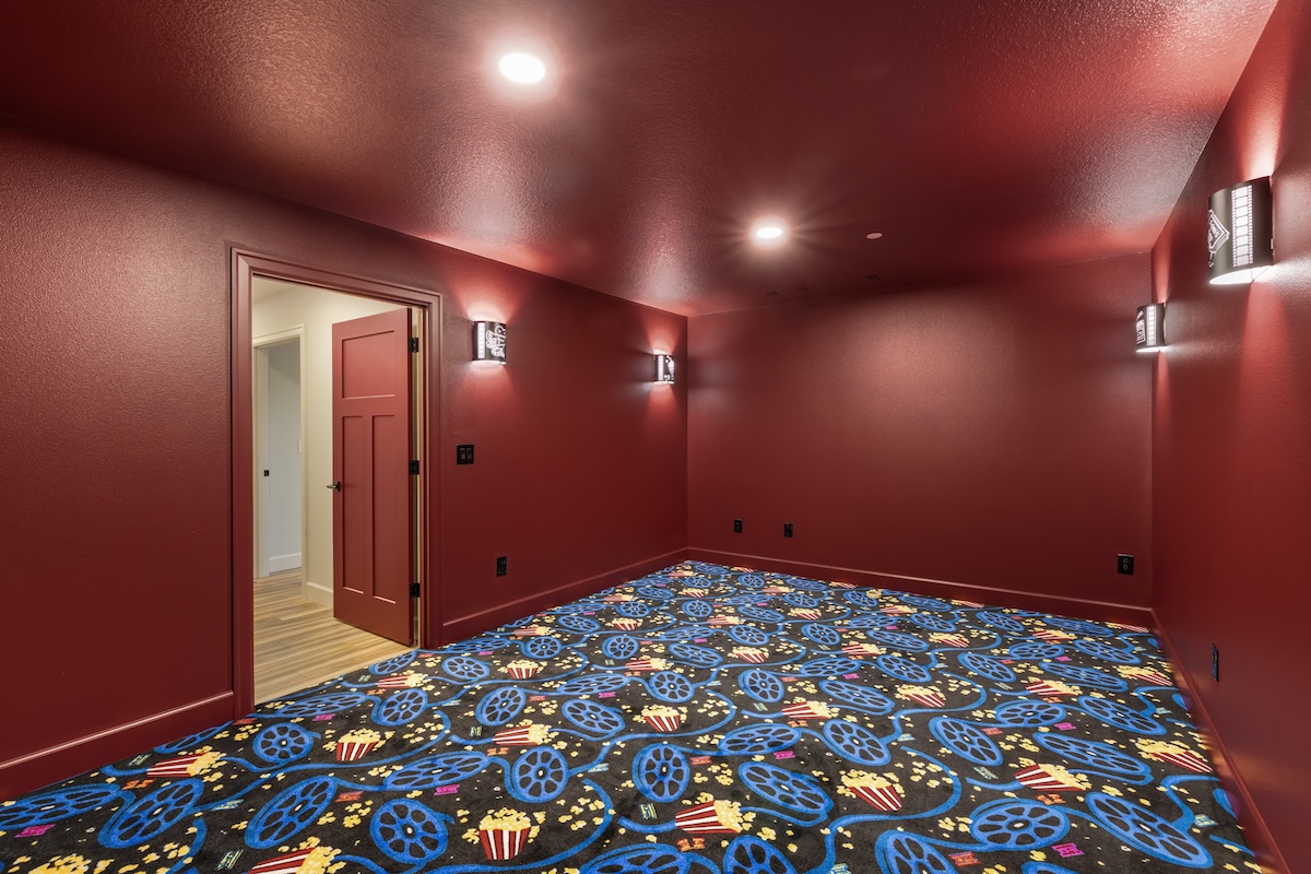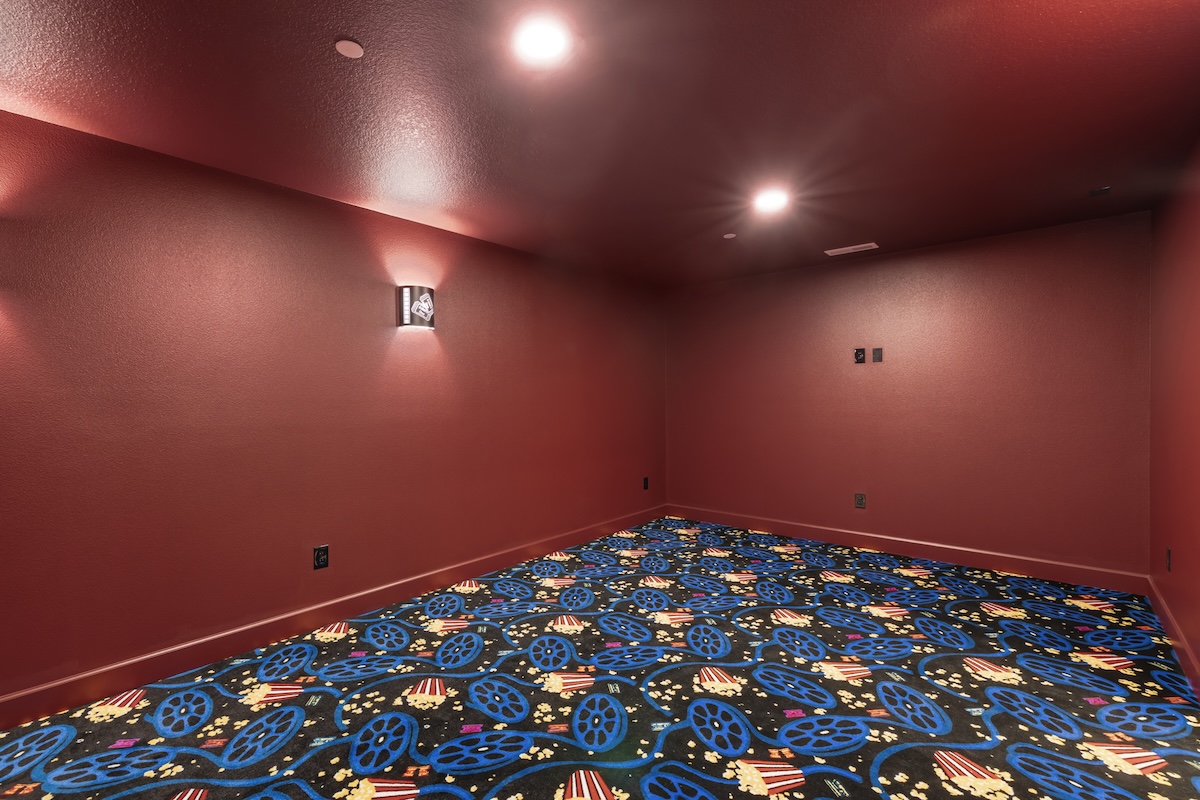 The floor plan includes 3 bedrooms, 3 offices or hobby rooms, a home theater, workout room, and an arcade, offering dedicated spaces for work, recreation, and relaxation. At the heart of the home, a spacious kitchen with warm wood tones and light cabinetry creates a welcoming place for gathering.
